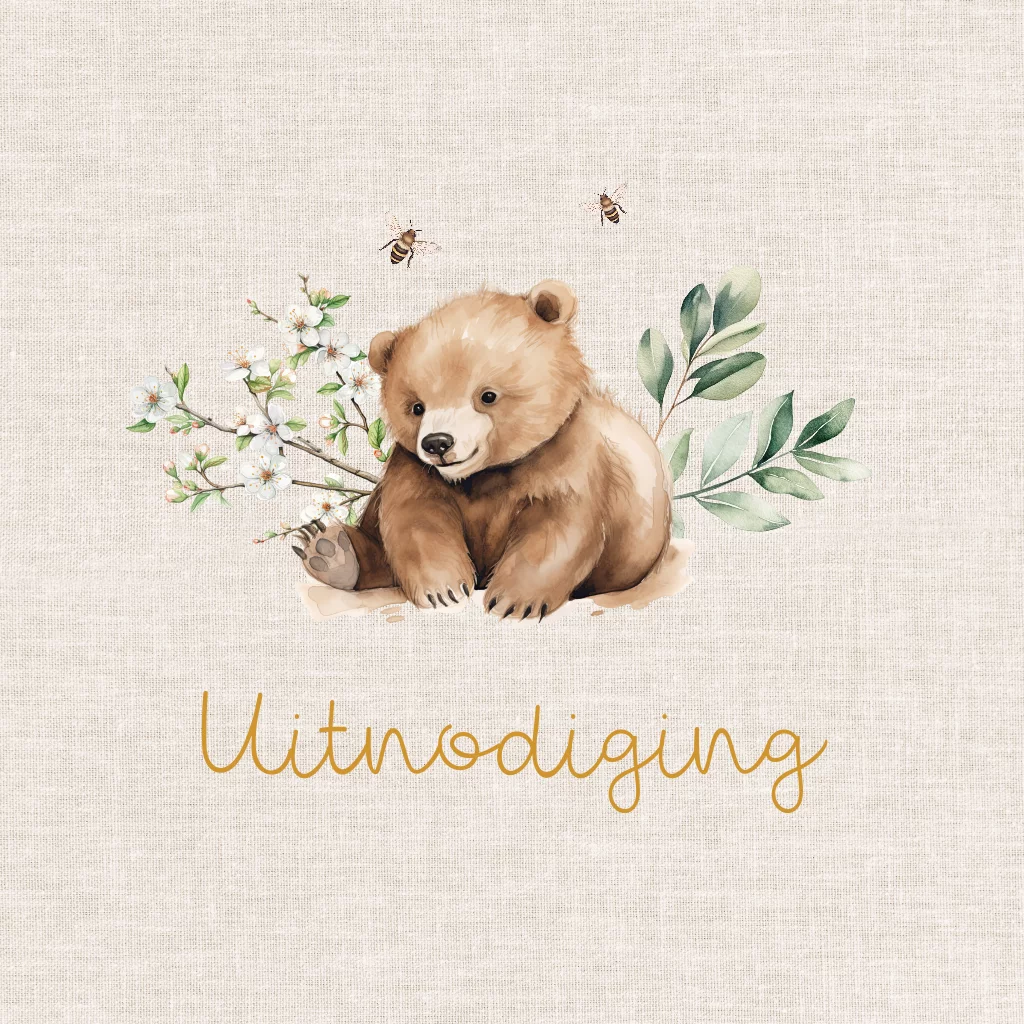 Schattig babyborrelkaartje met klein beertje in aquarel tussen bloesems, bladeren en bijtjes op fijn textiel motief. Dit kaartje meet 8 x 8 cm en kan samen met het geboortekaartje verzonden worden. Pas dit kaartje volledig naar wens aan in de editor.