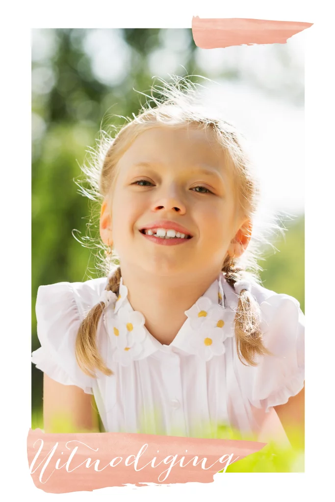 Uitnodiging voor lentefeest of communie met foto en speelse aquarelstrepen. Upload je eigen foto en pas dit kaartje volledig naar wens aan in de editor.