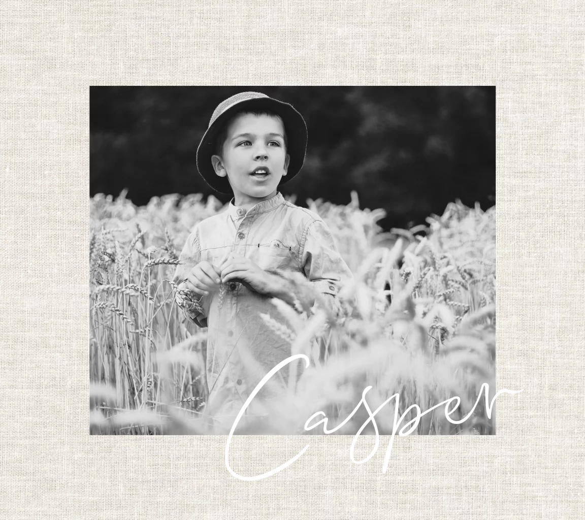 Stijlvolle uitnodiging op vals vierkant formaat met foto op een linnenmotief en naam in goudfolie. Upload je eigen foto en pas dit kaartje aan in de editor.