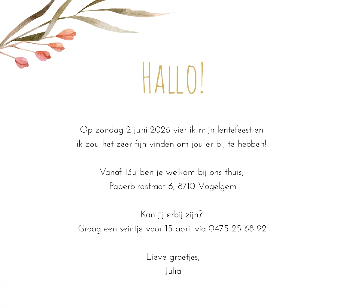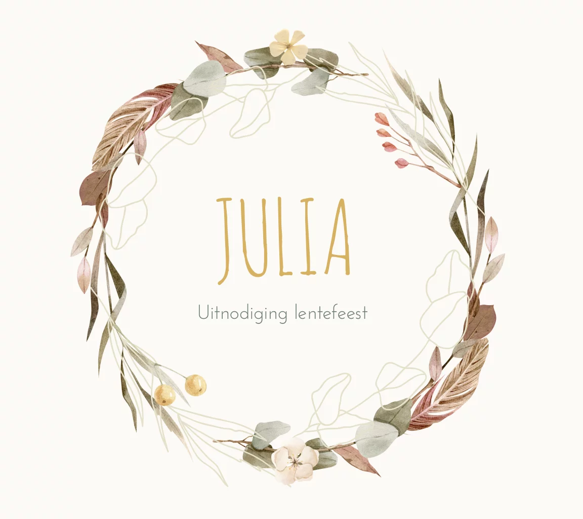 Fleurige vouwkaartje met bloemenkrans voor lentefeest of communie in bohostijl. Aan de binnenzijde is er plaats voor een leuke foto. Pas dit kaartje naar wens aan in de editor.