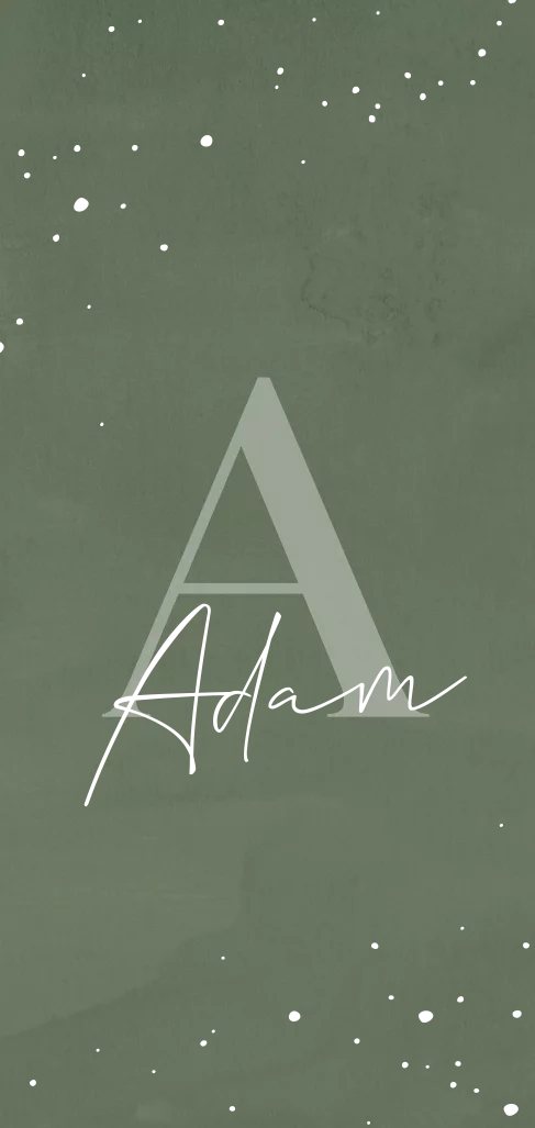 Een stijlvol geboortekaartje voor jullie zoontje, met grote initiaal met daaronder de volledige naam in sierlijk, gouden lettertype op een donker groene achtergrond. De gouden spikkeltjes geven dit kaartje extra élégance.