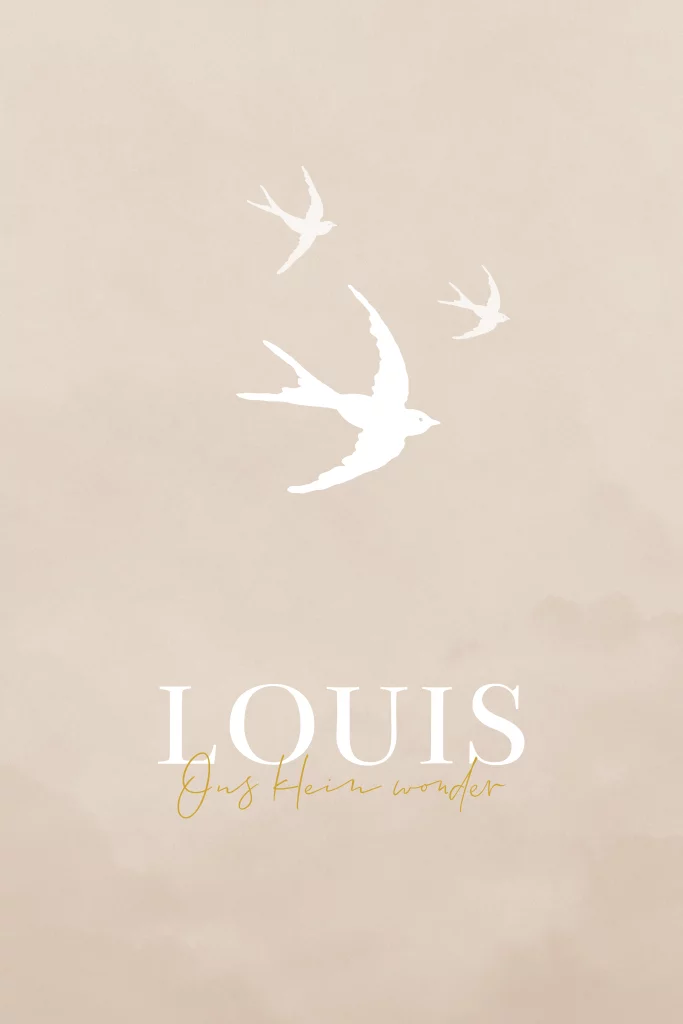 Geboortekaartje met drie witte zwaluwen op een beige achtergrond. Pas tekst, lettertypes en kleuren eenvoudig aan in de online editor.