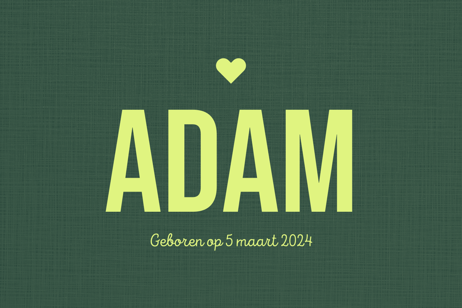 Minimalistisch geboortekaartje met donker groene linnen motief en fel groen accenten.