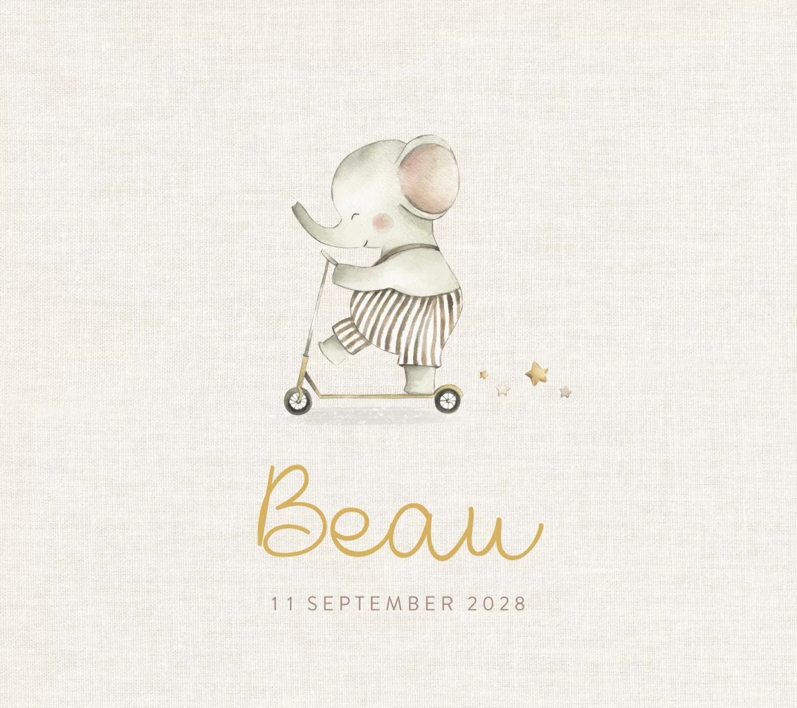 Schattig, speels geboortekaartje met illustratie van een olifantje op step. Pas de teksten, lettertypes en kleuren eenvoudig aan in de editor.