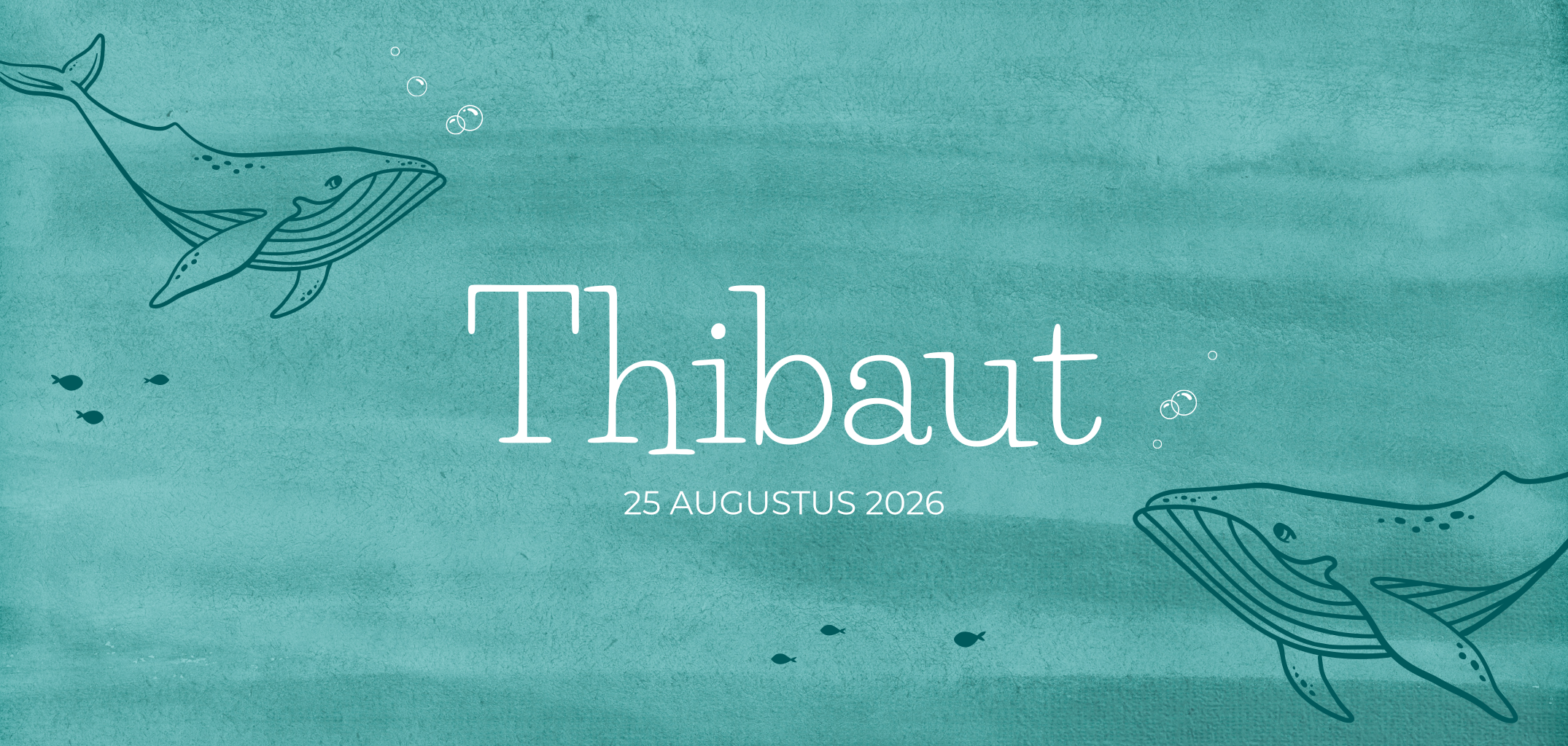 Speels langwerpig geboortekaartje met walvissen en visjes.