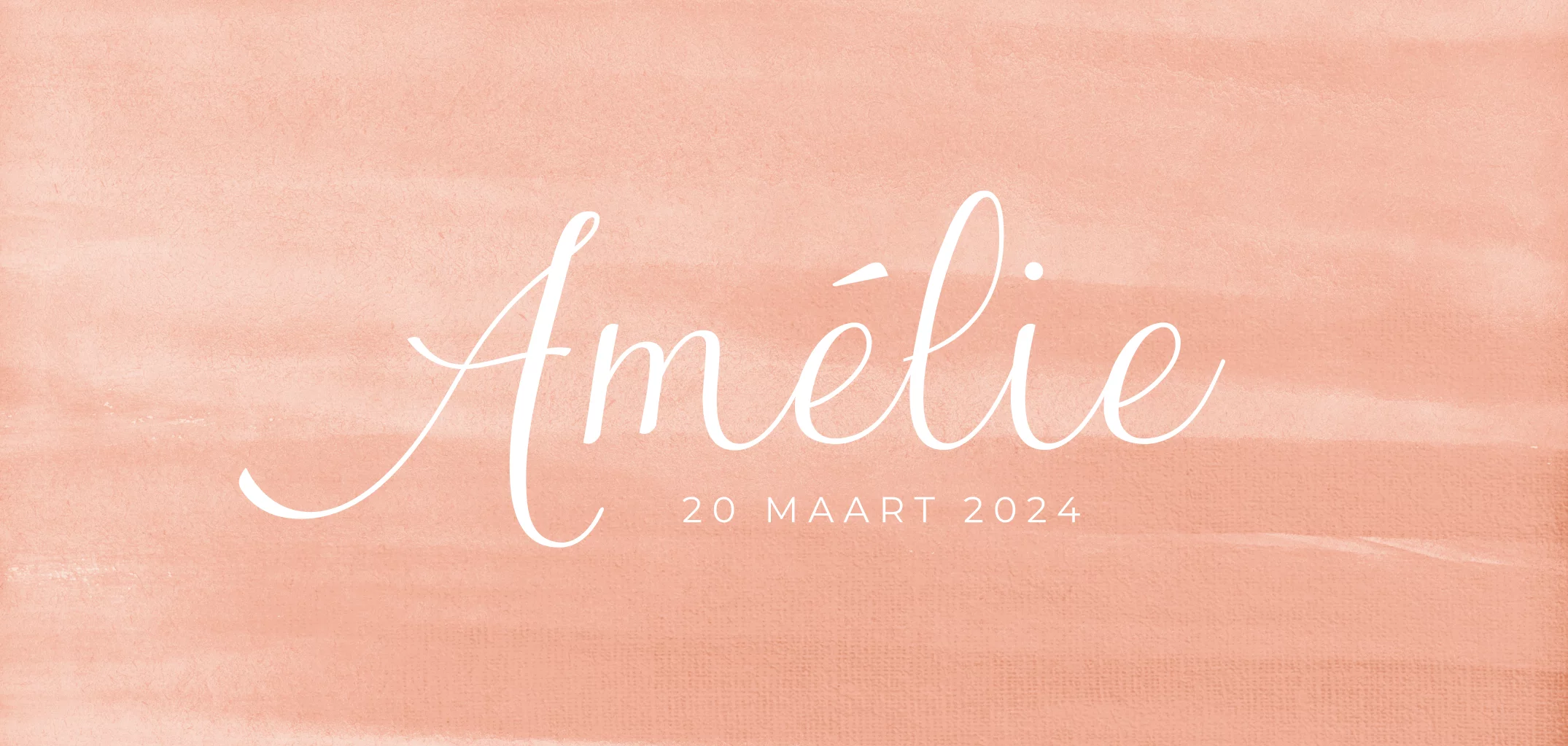 Minimalistisch geboortekaartje voor een meisje met als achtergrond een waterverf effect in het kleur 'apricot'.