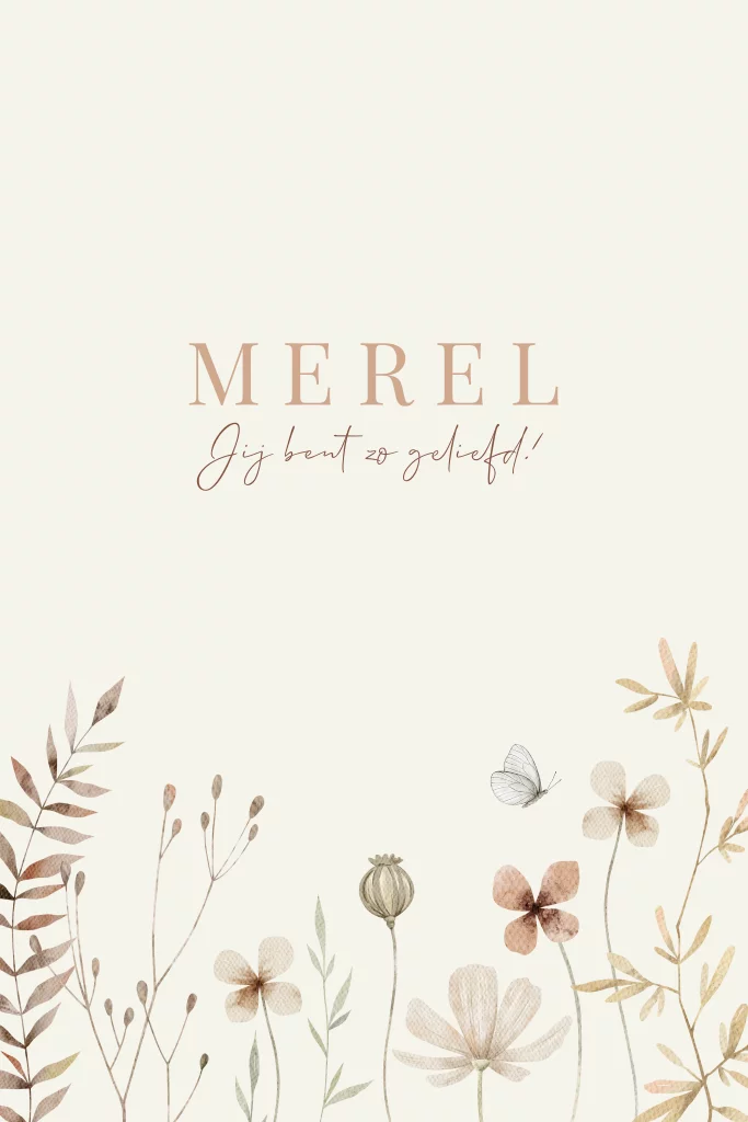 Geboortekaartje met geschilderde veldbloemen en vlinder.