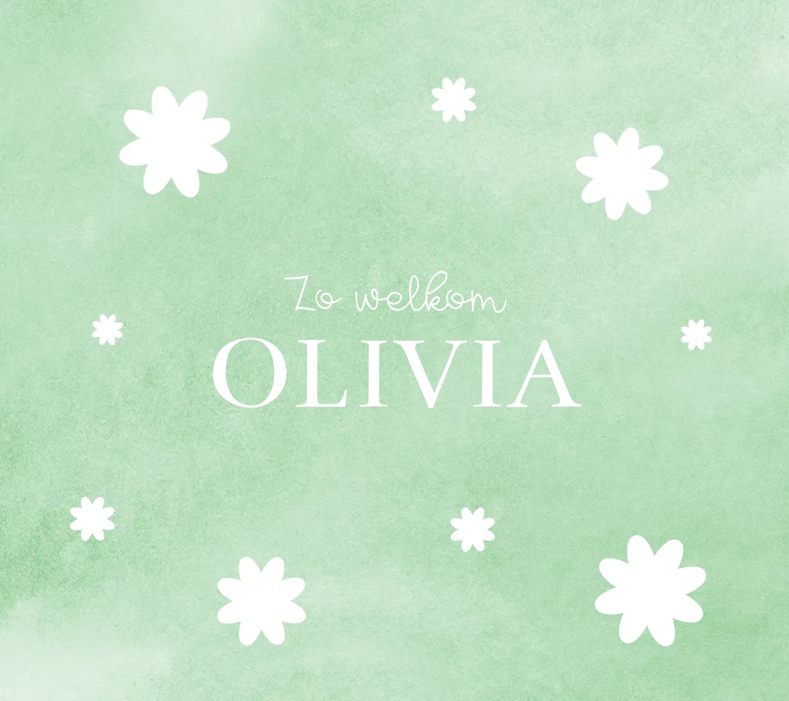 Lief geboortekaartje met witte bloemetjes. De cirkeltjes in de bloem worden, net als de naam, in goudfolie gedrukt.