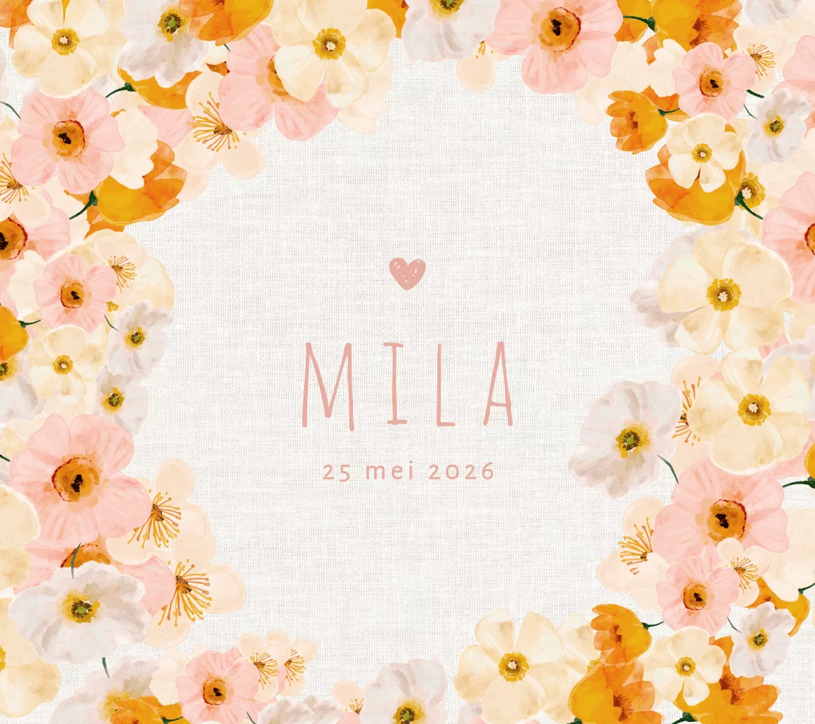 Lentekriebels? Kondig de geboorte van jullie baby'tje aan met dit fleurig kaartje met bloemenkrans.