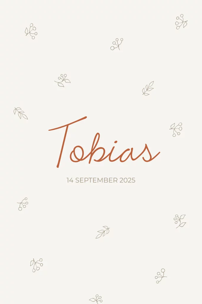 Schattig, minimalistisch geboortekaartje met kleine tekeningetjes van besjes en blaadjes. De zachte neutrale tinten en het plantenpatroon geven het kaartje een modern bohemian uitstraling. Dit lieflijke kaartje is geschikt voor zowel een jongen als meisje.