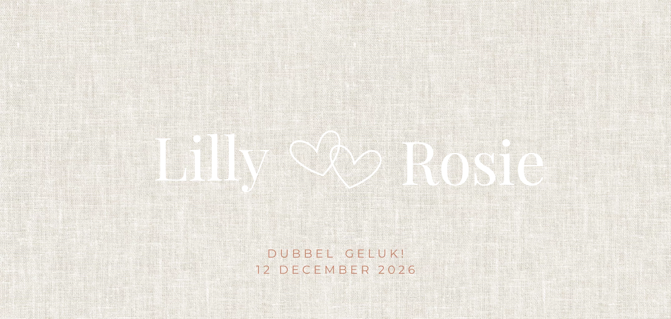 Dubbel geluk! Kondig de geboorte van jouw tweeling aan met dit stijlvol geboortekaartje. Naam en hartjes worden in goudfolie gedrukt. Pas dit kaartje naar wens aan in de editor!