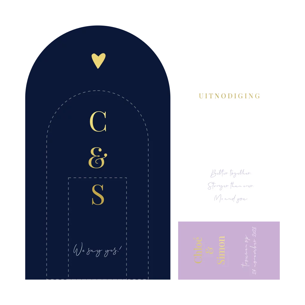 Strakke huwelijksuitnodiging met goudfolie. De uitnodiging bestaat uit 3 kaarten die je met een trendy gouden paperclip aan elkaar bevestigt.