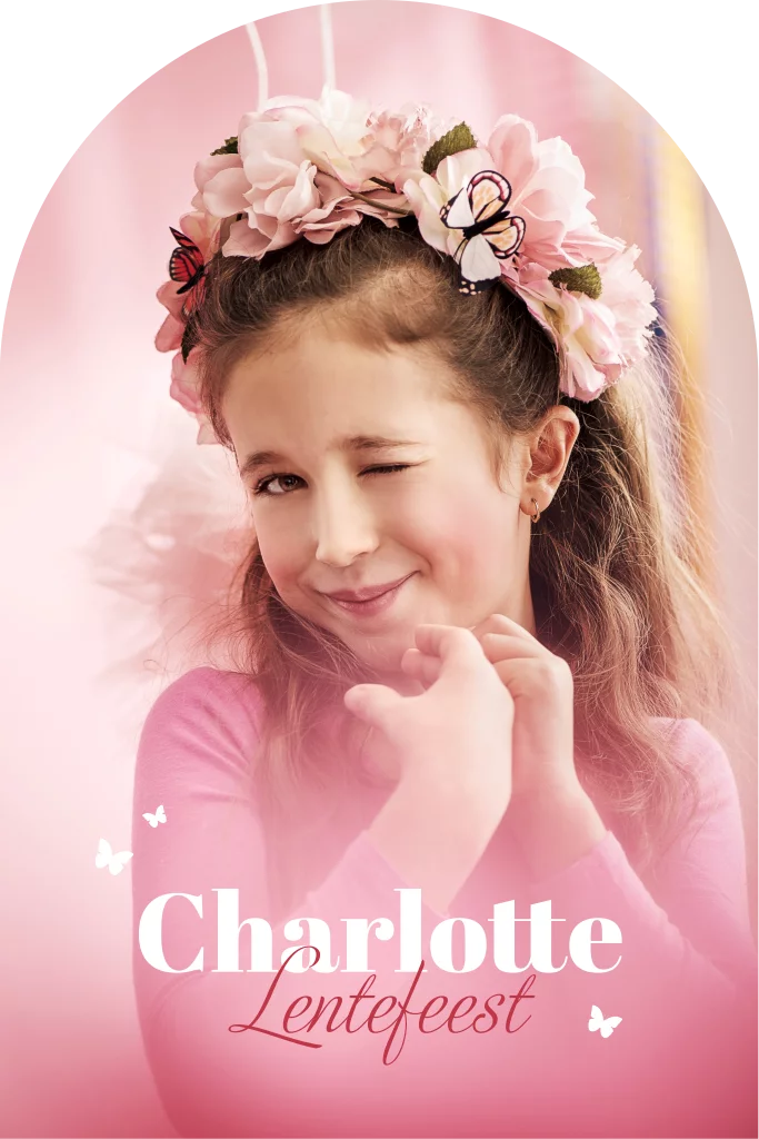 Leuke stolpvormige uitnodiging voor communie of lentefeest met foto van jouw zoon of dochter. Pas dit kaartje naar wens aan in de editor.