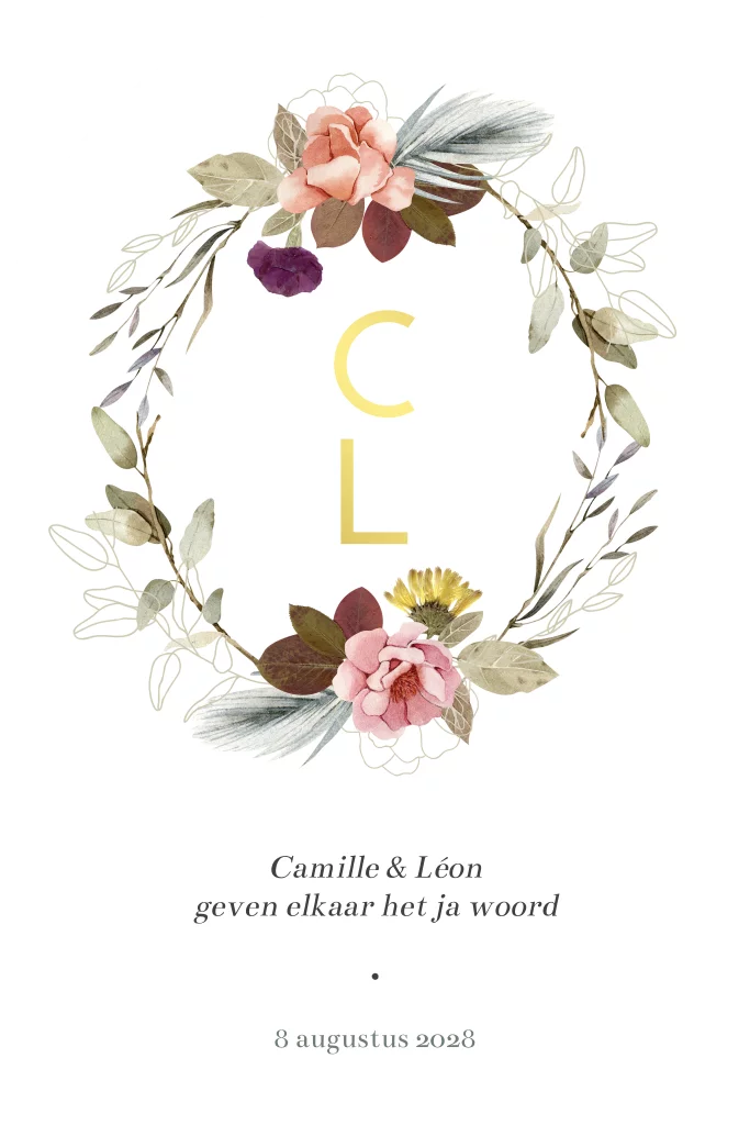 Fleurige uitnodiging trouw met bloemenkrans en goudfolie