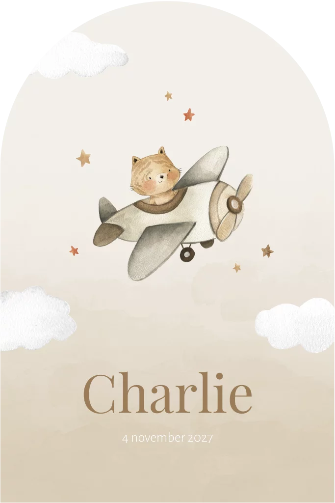 Geboortekaartje met schattige illustratie van een tijgertje in een vliegtuig met sterretjes en wolken. De neutrale, aardse tinten geven dit kaartje een rustig en natuurlijke uitstraling. Je kan teksten, lettertypes en kleuren eenvoudig aanpassen in de editor.