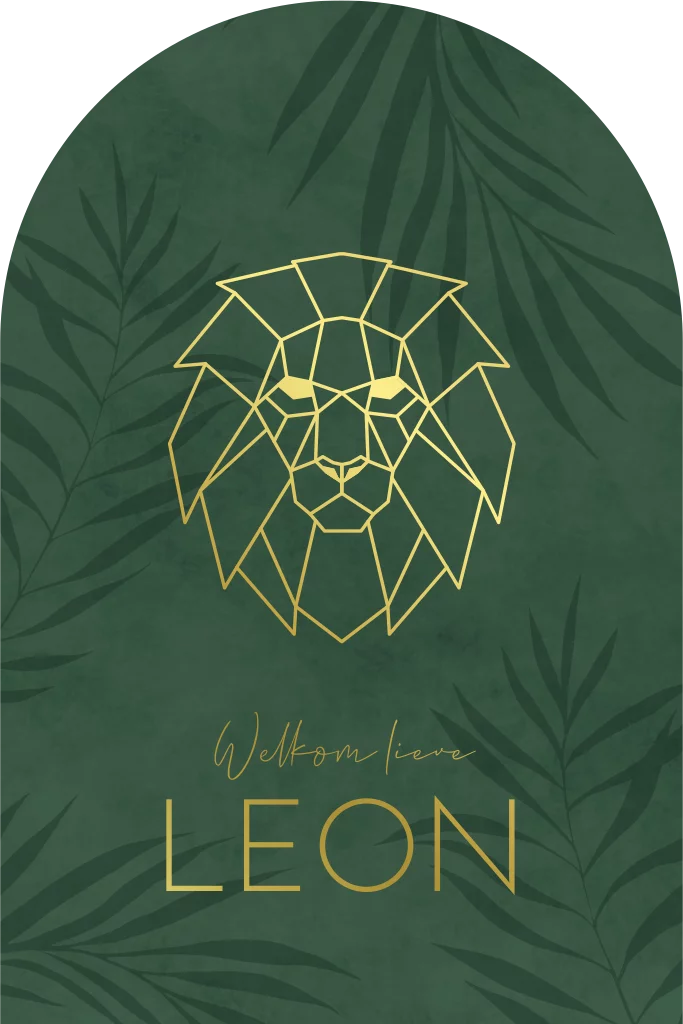 Welcome to the jungle! Stijlvol geboortekaartje met geometrische leeuwenkop en naam in goudfolie op donker groene achtergrond met palmbladeren.