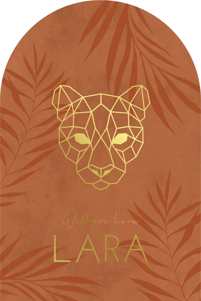 Welcome to the jungle! Stijlvol geboortekaartje met geometrische leeuwinnenkop en naam in goudfolie op oranje achtergrond met palmbladeren.