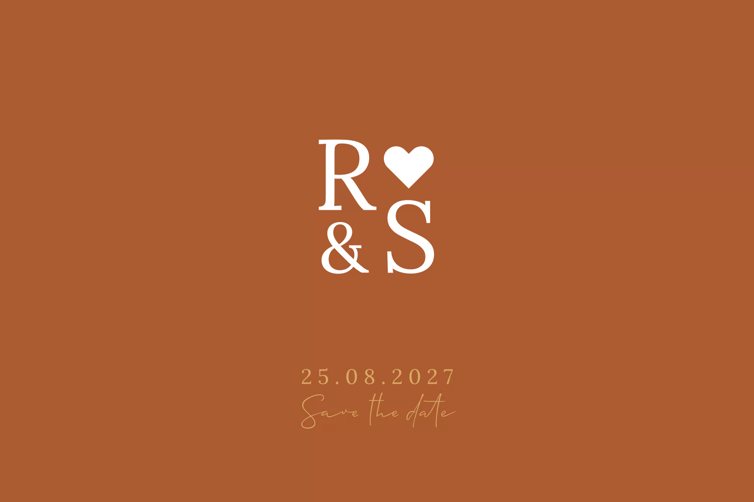 Minimalistisch save the date kaartje met gouden initialen op gekleurde achtergrond.