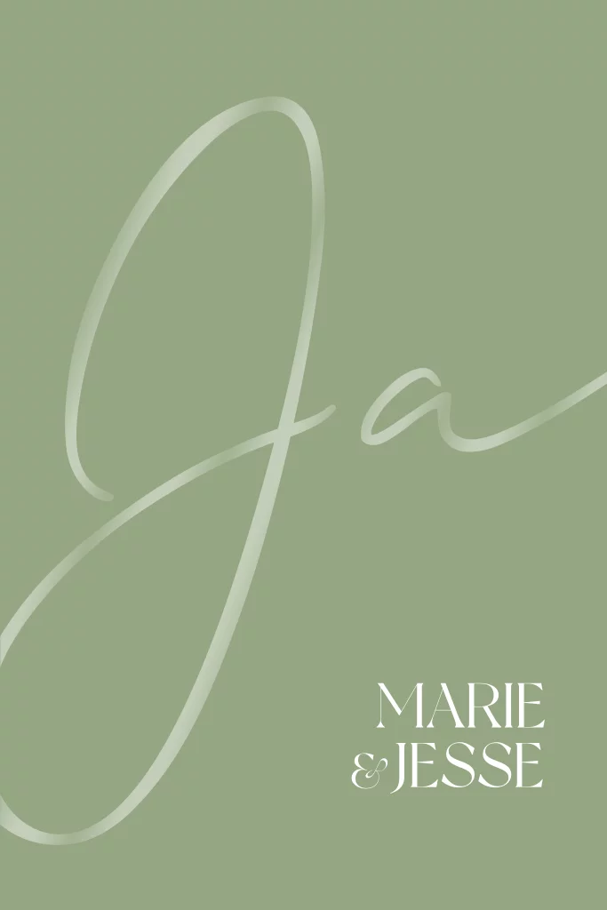 Minimalistische uitnodiging met grote "Ja" in hoogglans. Deze eenvoudige, strakke trouwkaart is perfect voor koppels die houden van een moderne, cleane uitstraling. De grote "Ja" in hoogglans trekt meteen de aandacht. Zeg "Ja" tegen elkaar en deze kaart.