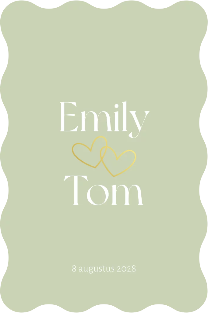 Door de unieke vorm springt deze stijlvolle trouwuitnodiging direct in het oog! De hartjes worden in folie gedrukt, pas dit kaartje naar wens aan in de editor.