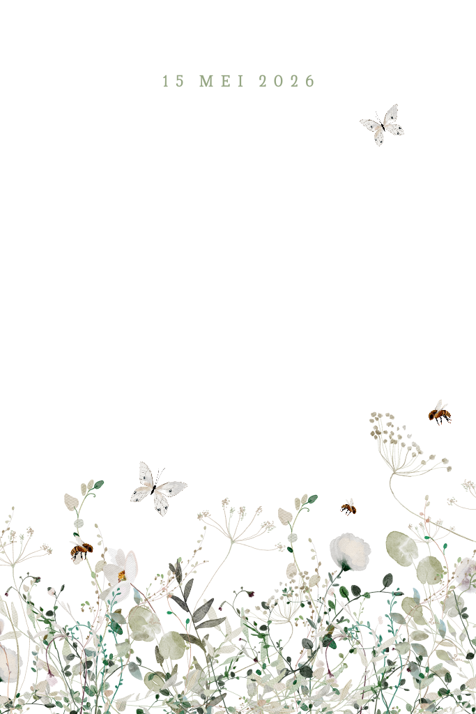 Fleurige trouwuitnodiging met een variatie aan weidebloemen, vlinders en bijen. Namen worden in zilver folie gedrukt.